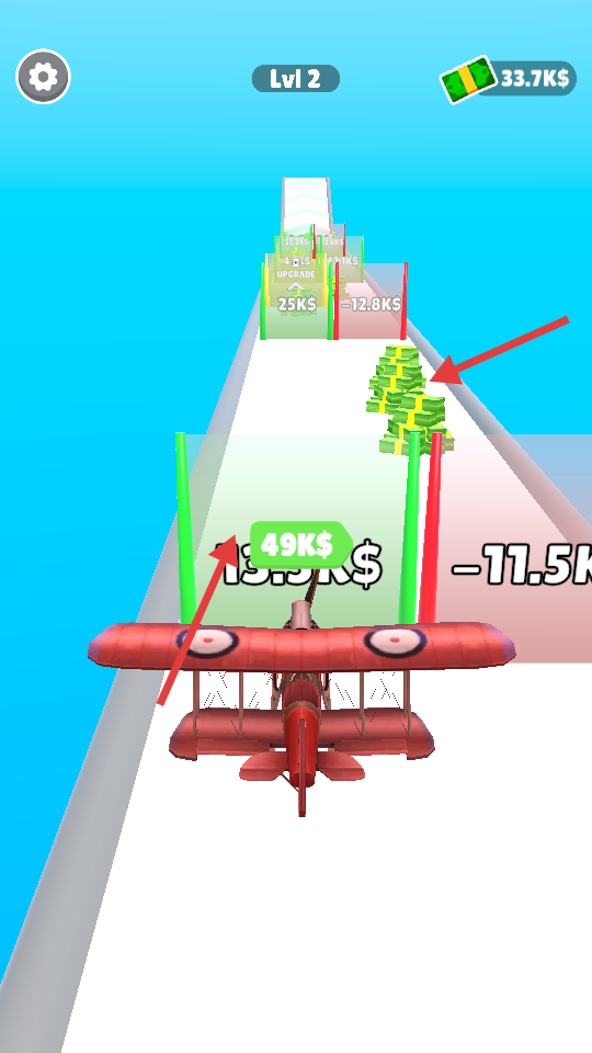 1、游戲中操控飛機飛行時,要盡量讓飛機穿過綠色區域,這樣能獲得金錢獎勵,同時避開紅色區域,避免飛機損失金錢。