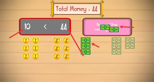 3、玩家在購物結算時對比金額10小于44,需要通過金幣與綠鈔換算確保總錢數達標完成超市購物任務。