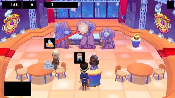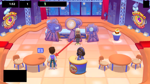 1、進入游戲帶有攝像機、燈光等設備的餐廳場景里,操控角色前往柜臺處,與柜臺后的人物互動,開啟游戲流程。