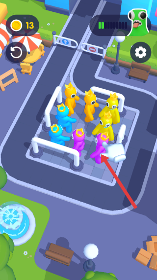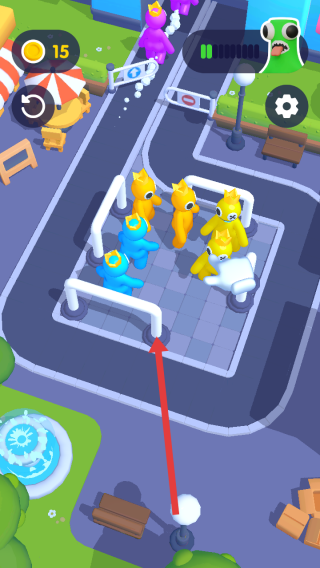 1、游戲玩家操控彩色小人圍欄區域活動,可將不同顏色的小人聚攏,為后續操作做準備。