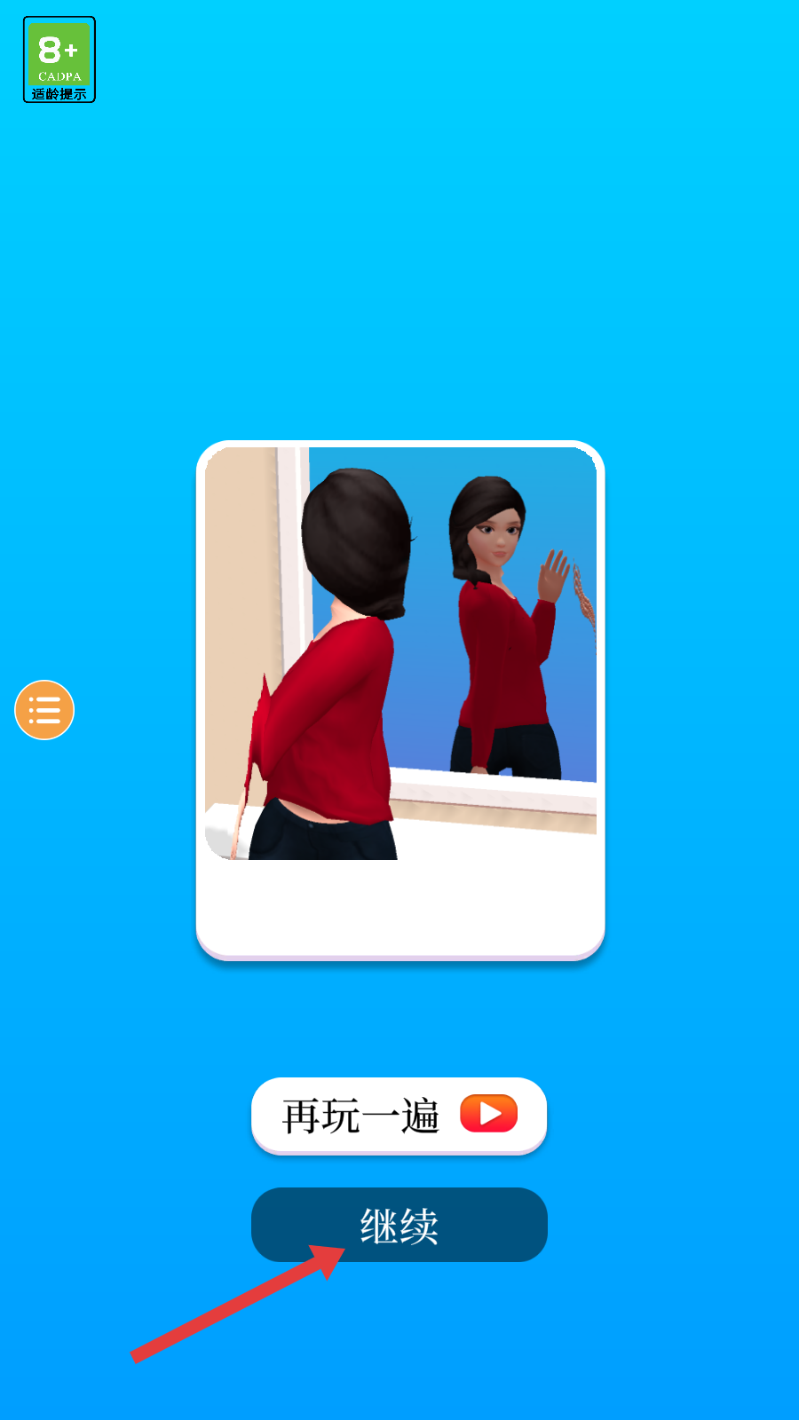 2、完成好人物形象變形后,界面會出現再玩一遍和繼續按鈕,可選擇繼續進入下一個形象變形挑戰。