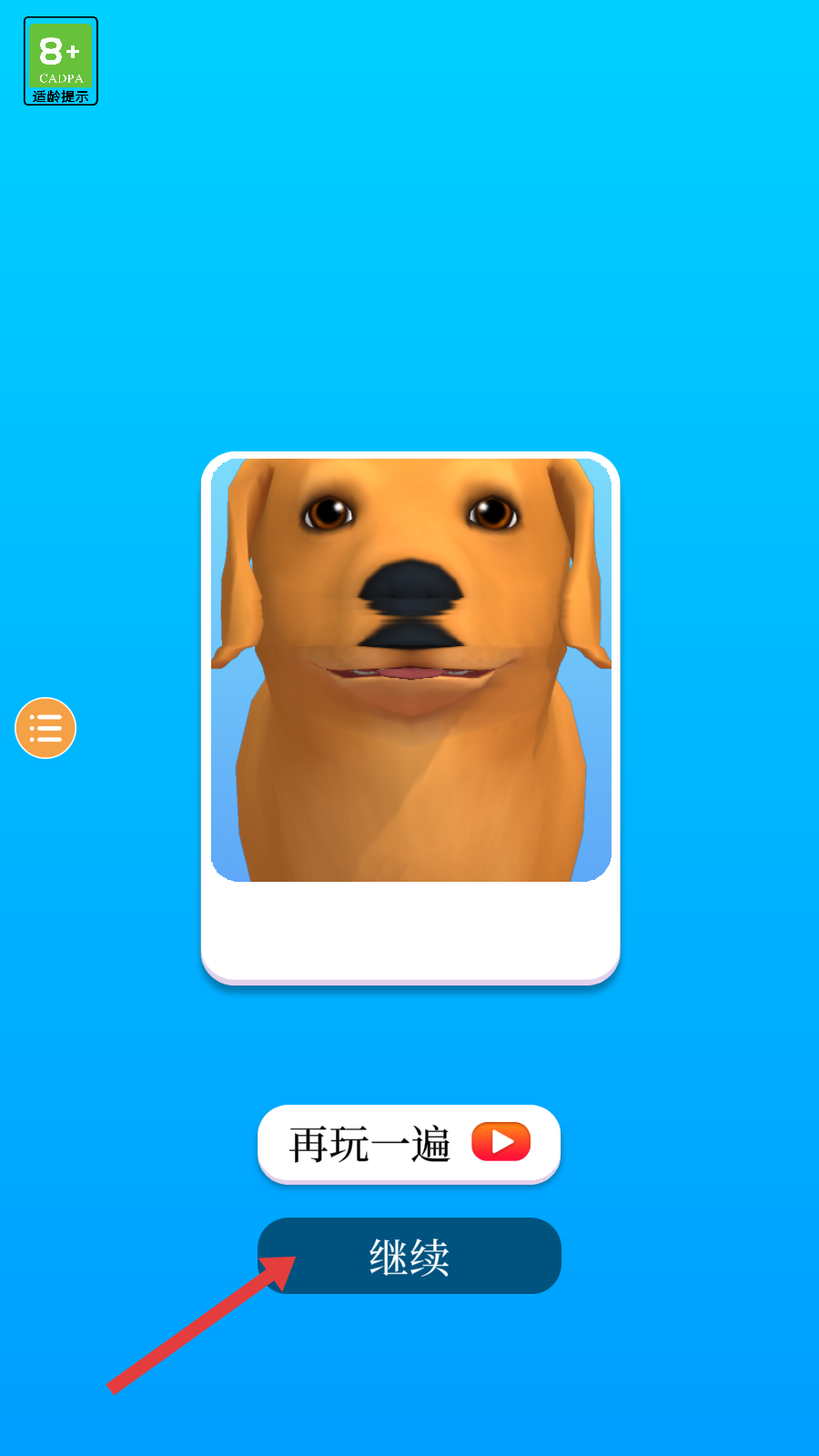4、完成動物形象變形后,再次出現再玩一遍和繼續按鈕,可選擇繼續,繼續體驗不同的形象變形樂趣。