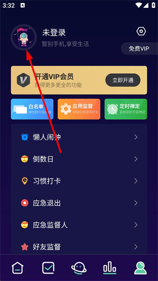 2、進入個人板塊會顯示未登錄狀態,可查看開通VIP會員的入口,也能使用白名單應用監督等功能,還可進入懶人鬧鐘倒數日等輔助功能頁面。
