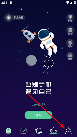1、進入應用首頁可看到新人教程等功能入口,頁面顯示設定時長,點擊開始即可啟動暫別手機的專注模式,同時底部導航欄可切換不同功能板塊。