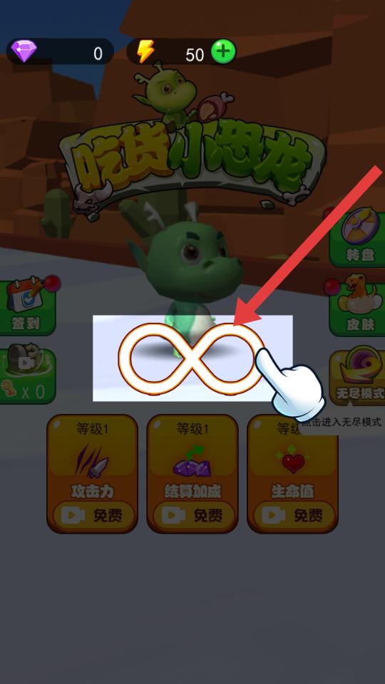 1、進入游戲,看到可愛的小恐龍和各種功能按鈕,點擊進入無盡模式,開啟吃貨冒險。