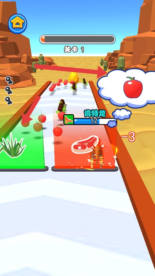 2、動態成長機制:通過持續收集場景中的水果與肉類道具,恐龍會實時顯示體積膨脹效果,體型越大獲得的速度加成就越明顯。