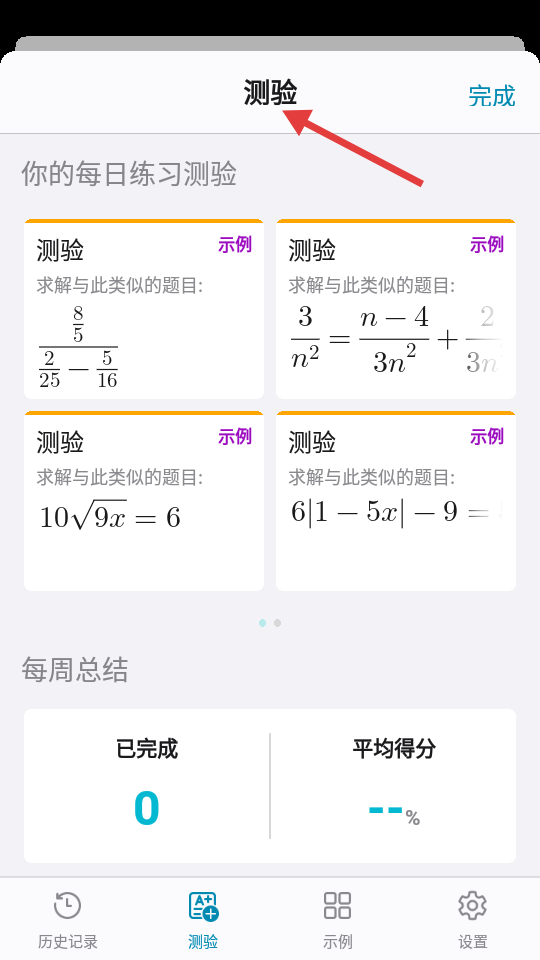 1、測驗頁面展每日練習,含分式根式等多樣數學題,助你鞏固知識,底部呈現每周總結進度與平均得分。