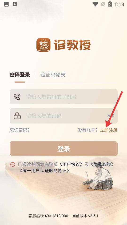 2、同意用戶協議和隱私政策后進入登錄界面,該界面有密碼登錄和驗證碼登錄兩種方式,若沒有賬號點擊立即注冊按鈕,即可進入注冊流程。