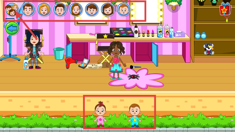 3、玩家在有化妝臺等物品的場景,可從上方人物頭像里選擇角色,下方還有可愛的寶寶角色可供互動,豐富游戲角色選擇與互動體驗。