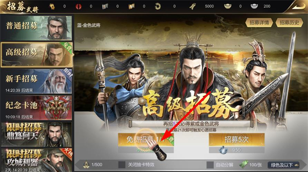 1、進行高級招募,免費招募獲取武將,再招多次必得紫色金色武將,擴充武將陣容,提升戰力。