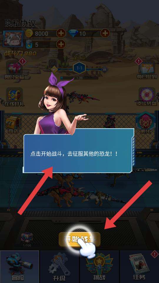 1、進入游戲,點擊開始戰斗,開啟征服其他恐龍的戰斗之旅,準備參與恐龍之間的對決。