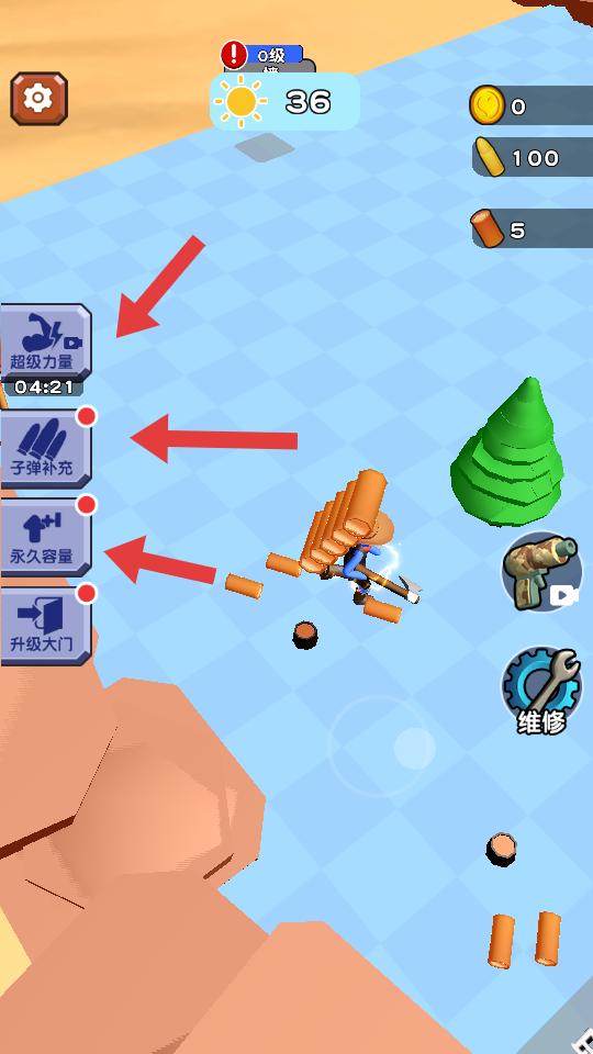 1、進入游戲后,可收集木材等資源,左側有超級力量,子彈補充等功能,能助力在島上的生存與后續建設。