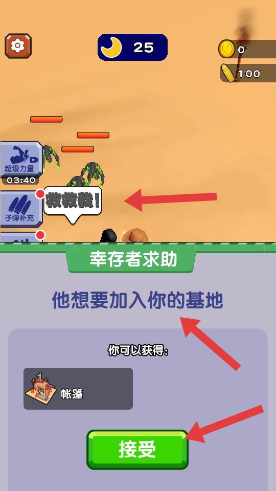 2、夜晚會有怪物出現,此時若遇到幸存者求助,可選擇接受,能獲得帳篷等物品,豐富基地的設施。