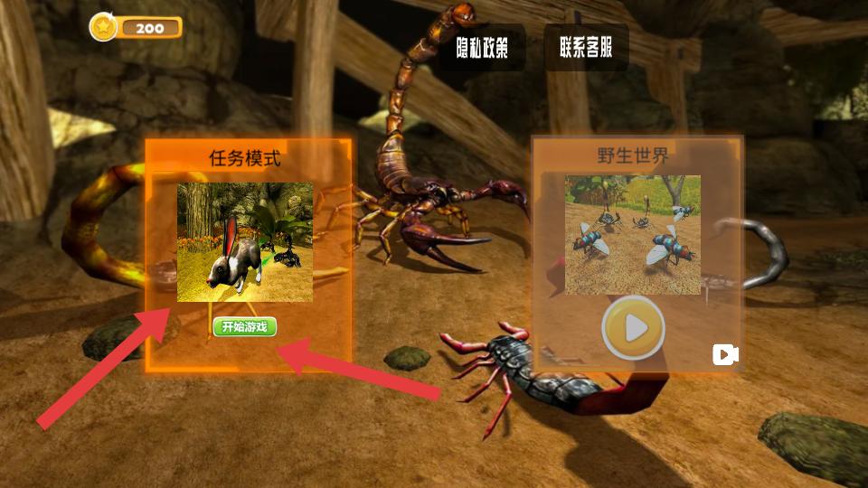 1、進入游戲,點擊開始游戲,可選擇任務模式或野生世界模式,不同模式有不同的游戲體驗,開啟昆蟲生存之旅。