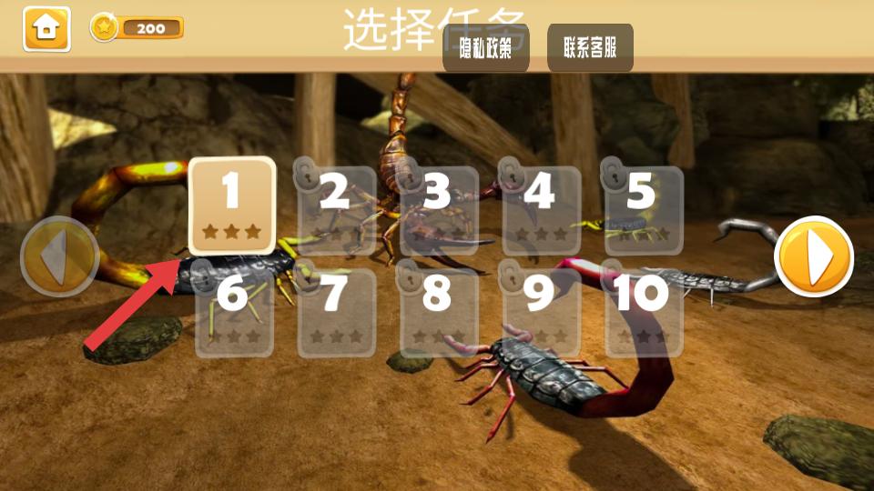3、進入關卡,看到選擇任務的界面,選擇標注指示1的關卡,選擇后,即可進入昆蟲的冒險之旅。