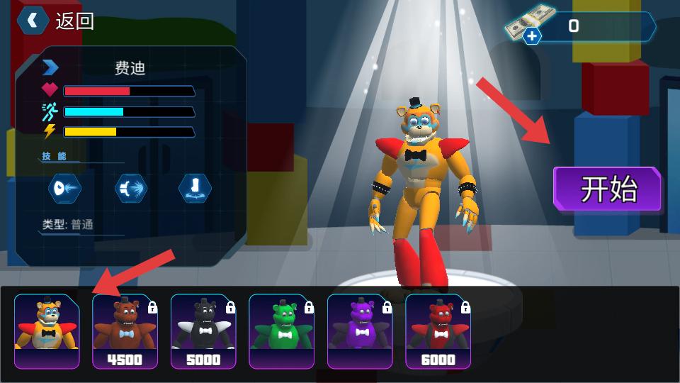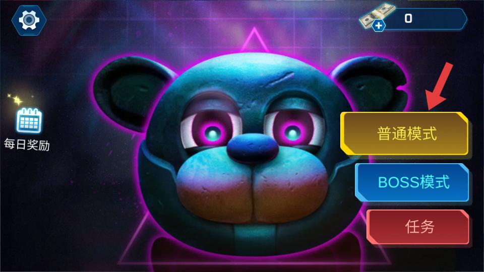 1、進入游戲,可選擇普通模式,BOSS模式或任務,選好模式后,進入角色選擇界面,挑選喜歡的玩具熊角色,點擊開始。