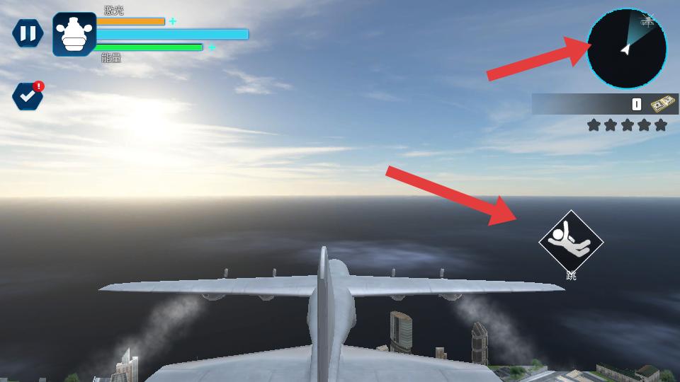2、角色選定后,會出現在飛機上,可查看界面的雷達等提示,然后點擊跳,從飛機上跳下,開啟冒險。