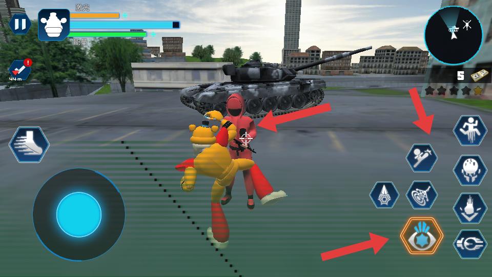 3、跳下后,來到城市等場景,會遇到敵人,利用左側移動按鈕操控玩具熊移動,靠近敵人準備戰斗。