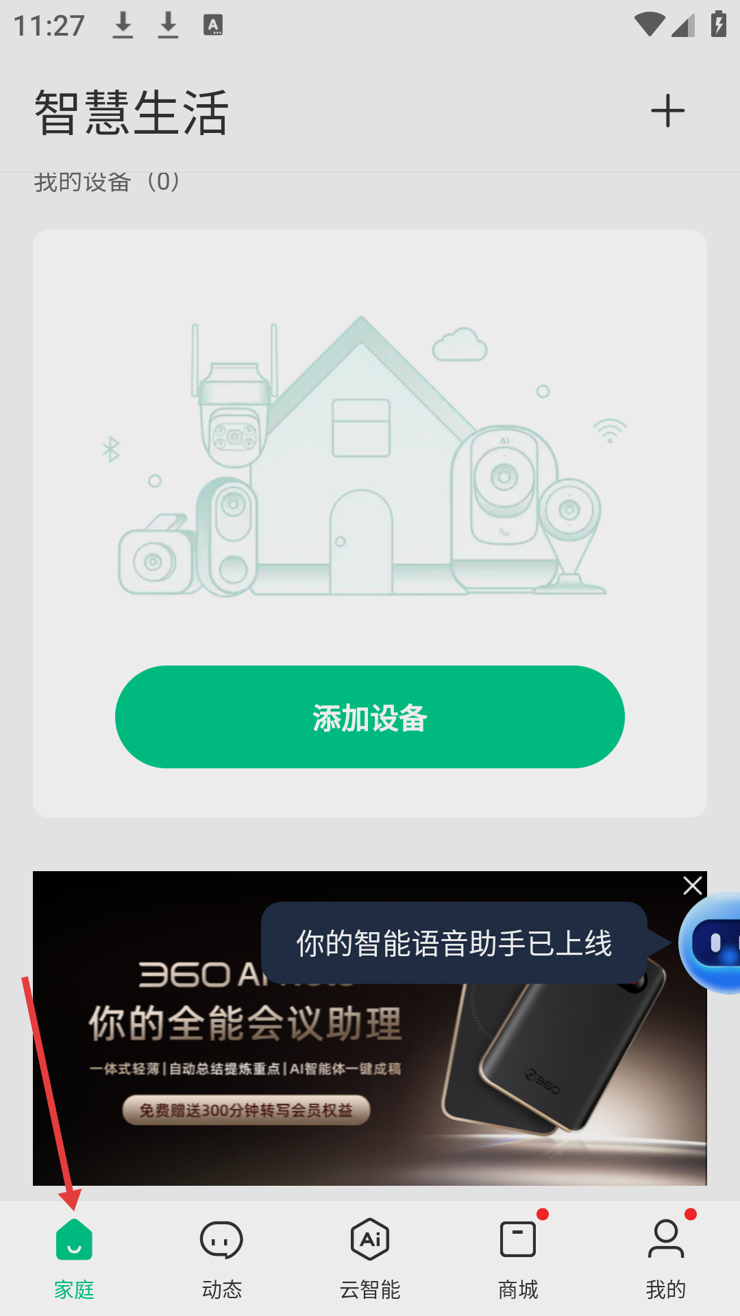 1、家庭頁面可添加智能設備,當前無設備,有360全能會議助理廣告,智能語音助手已上線,方便管理智能硬件。