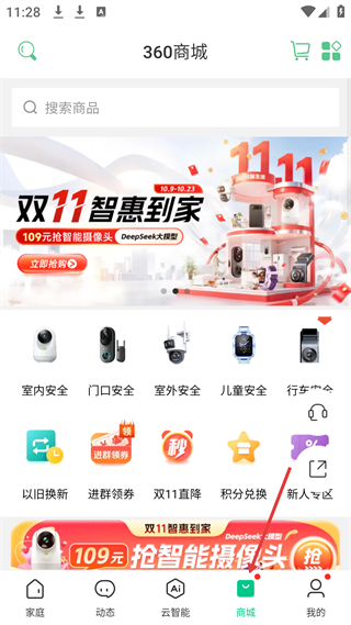 3、商城頁面雙11有智惠到家活動,109元搶智能攝像頭,分類涵蓋室內、門口安全等,還有以舊換新領券等優惠。