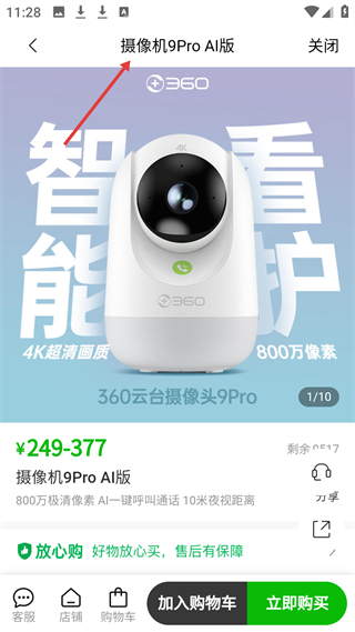 4、展示360攝像機9ProAI版,4K超清、800萬像素,支持AI一鍵呼叫、10米夜視,售價249、377元,可加入購物車或立即購買。