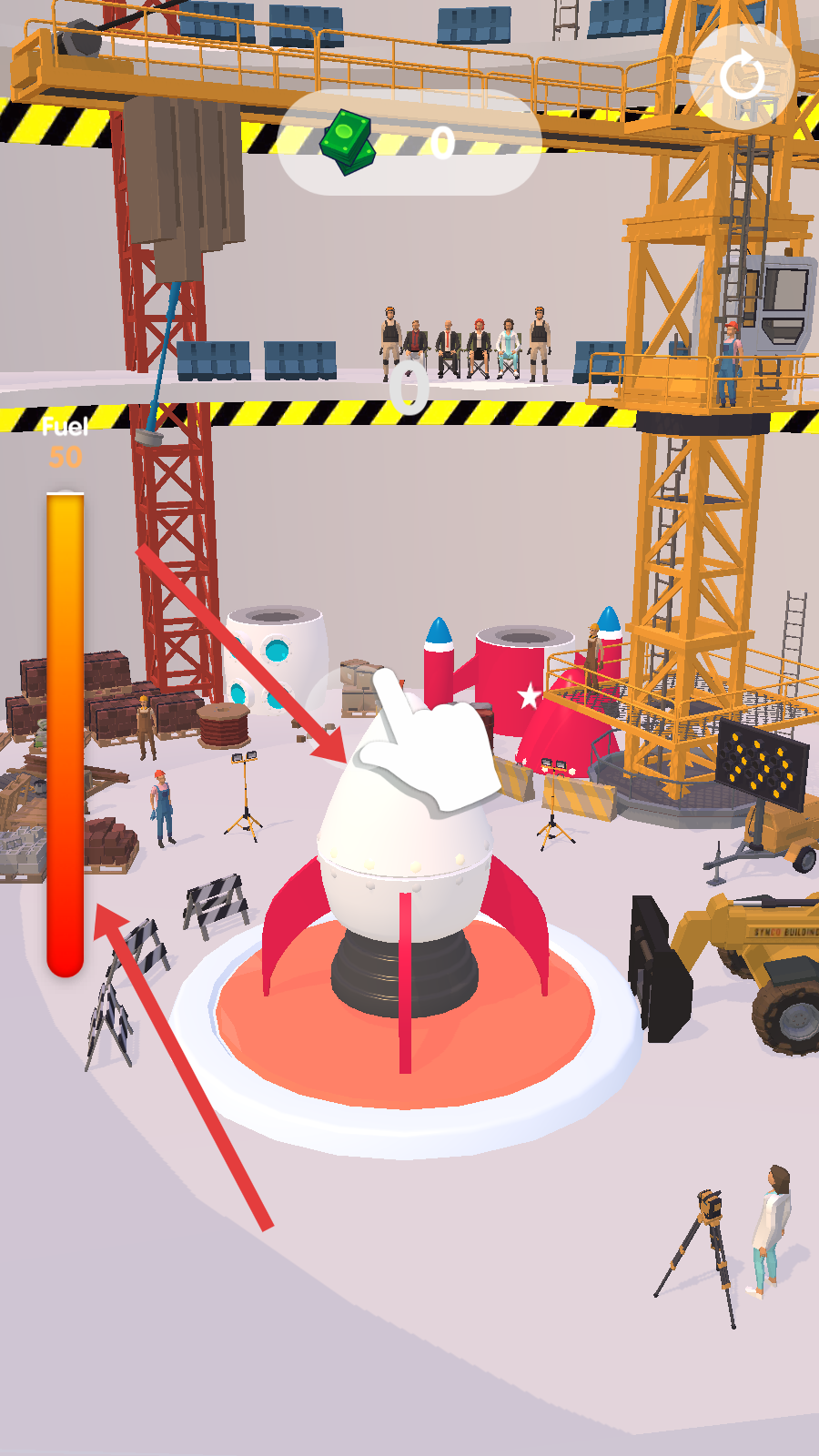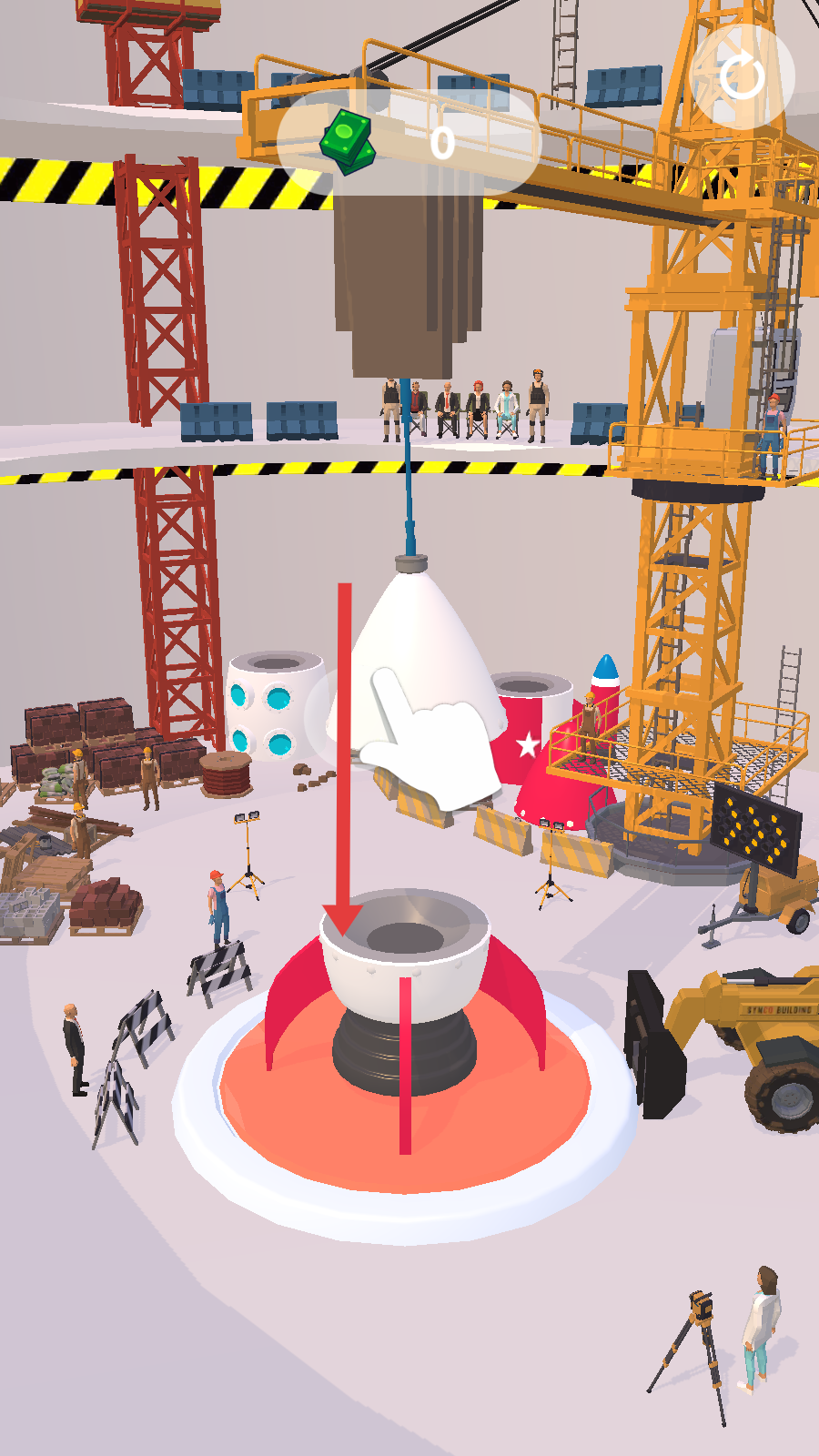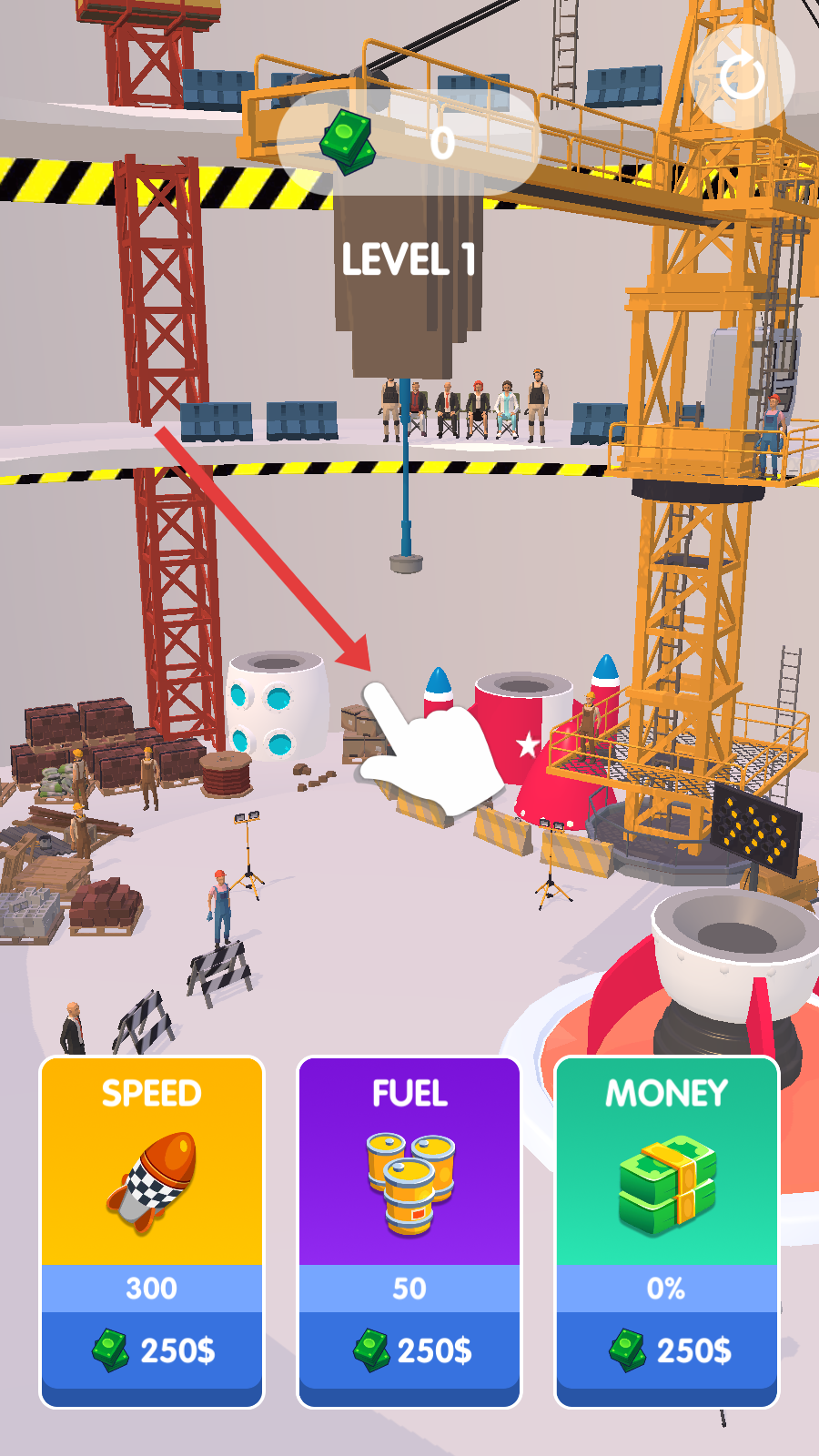 1、進入游戲處于關卡1場景,可看到各種建筑材料和工具,按照提示操作,開始火箭建造流程,為后續發射做準備。