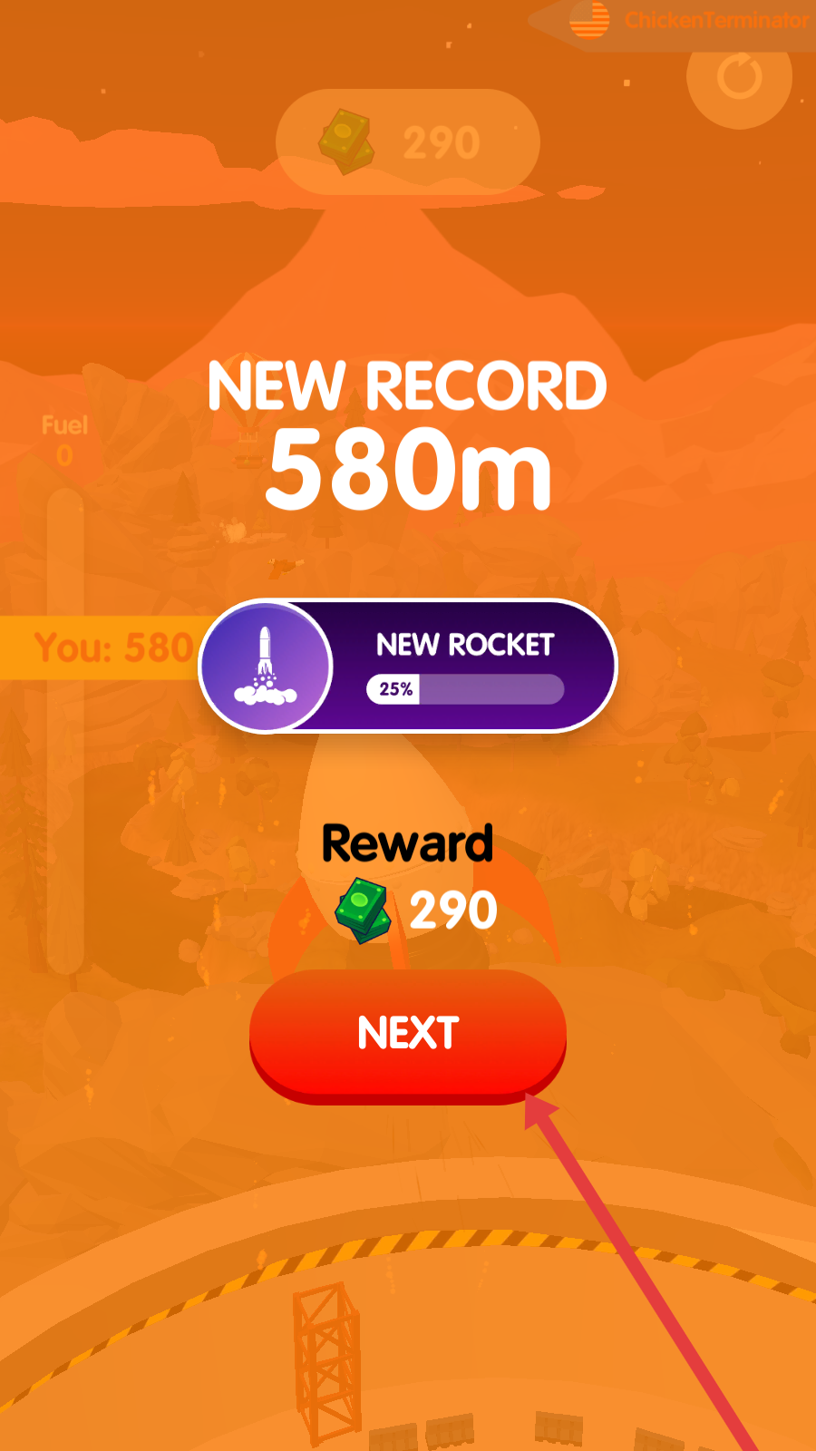 4、火箭發射后,會顯示飛行距離等數據,若創造新紀錄,還能獲得獎勵,之后點擊NEXT,開啟下一次火箭建造發射挑戰。
