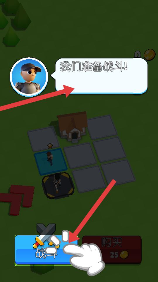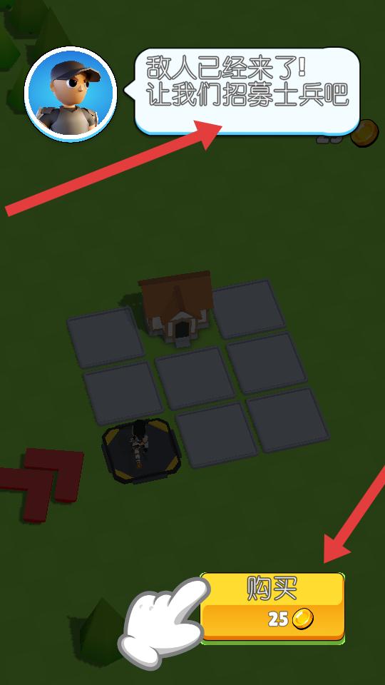 1、敵人來襲時,點擊購買,花費25金幣招募士兵,壯大防御力量,為戰斗做準備。