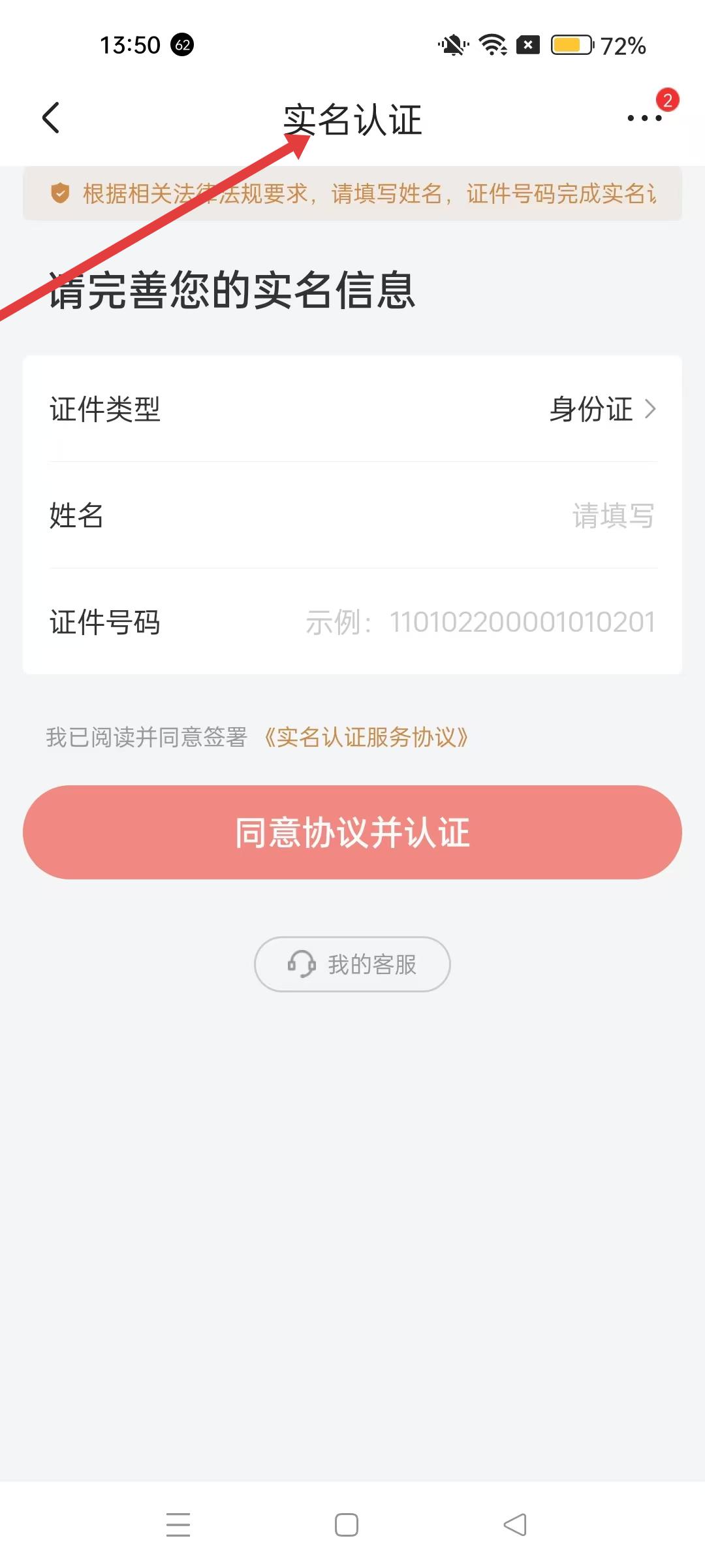 4、實名認證頁面選擇證件類型為身份證,填寫姓名和證件號碼,點擊同意協議并認證,完成實名認證。