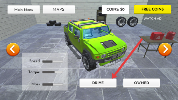 2、車輛選擇界面,有一輛綠色的車,可調節速度、扭矩、質量等參數,點擊DRIVE能駕駛車輛進入場景。