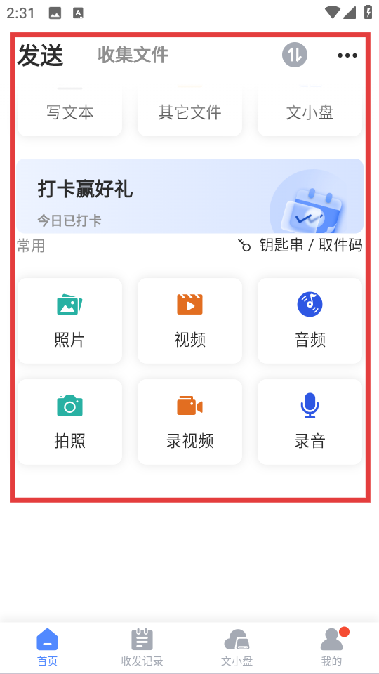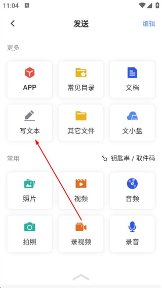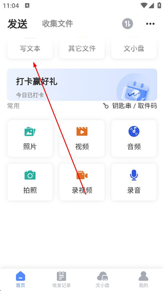 1、首頁的發送界面可以選擇多種文件類型進行發送,有寫文本、其它文件等選項,下方還有常用功能區包含照片等按鈕,方便快速選擇或創建要發送的文件內容。