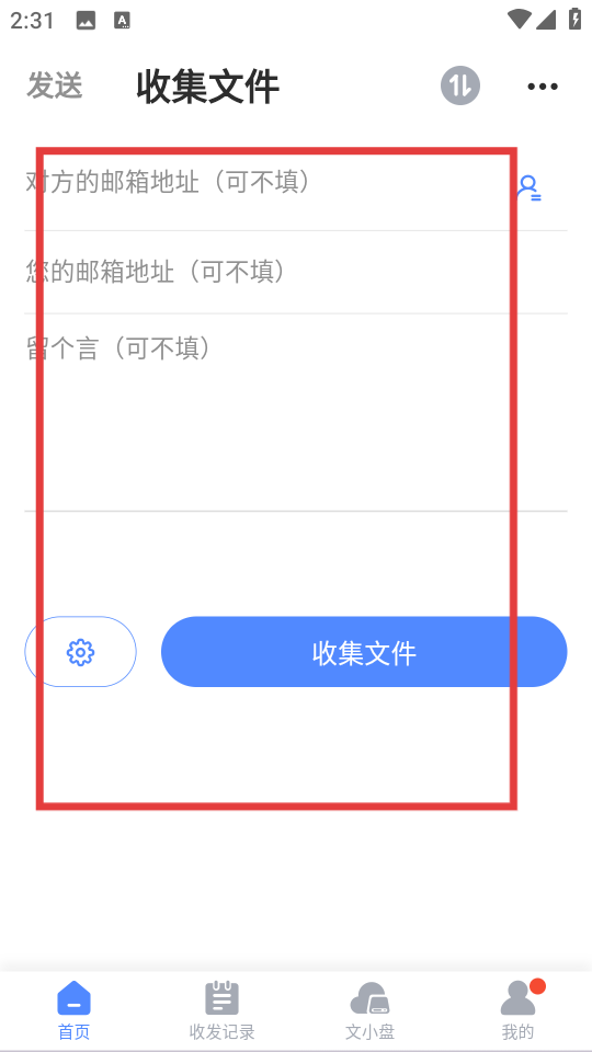 2、切換到收集文件界面,可以設置收集文件的相關信息,可以填寫對方的郵箱地址、你的郵箱地址以及留言內容,填寫完成后點擊收集文件按鈕,就能發起文件收集任務。