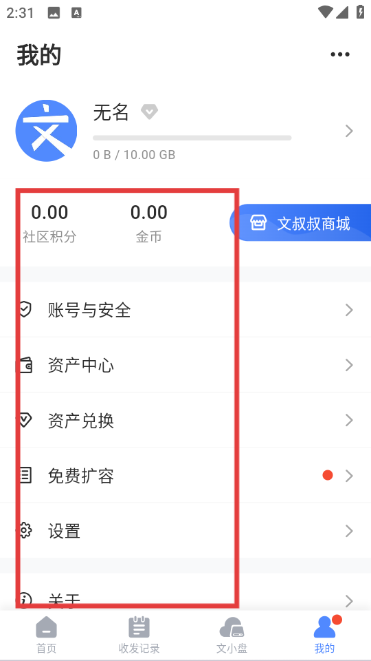 3、我的頁面這里展示了你的賬號信息,包括用戶名和存儲空間使用情況,還能看到社區積分和金幣數量,下方有賬號與安全、資產中心、資產兌換、免費擴容等功能選項。
