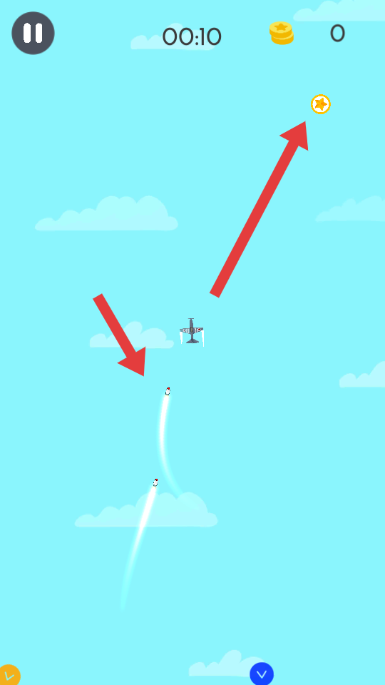 1、進入游戲,操控角色在空中飛行,上方顯示時間和金幣數,要沿著指引方向,在藍天與白云間穿梭,開啟飛行挑戰。