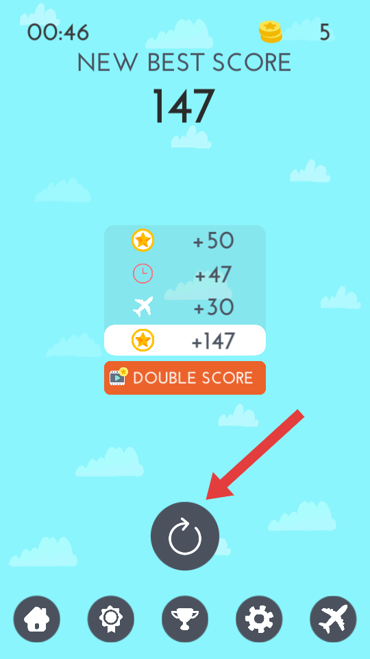 4、飛行結束后,會顯示新的最佳分數及得分構成,若想再次挑戰,點擊重新開始按鈕,開啟新一輪空中飛行冒險。