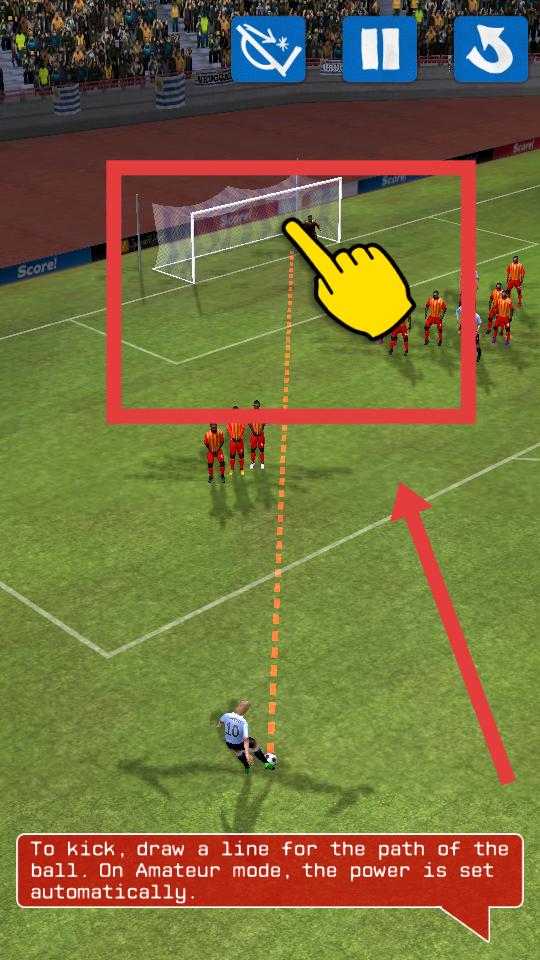 3、比賽過程中依據提示,用手指畫出足球運動路線,讓球員朝著球門方向射門爭取得分。