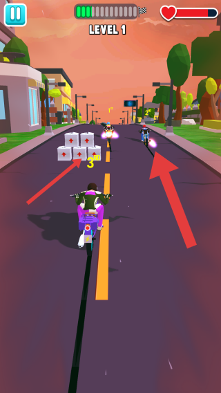3、在行駛過程中留意道路上的道具和障礙物,遇到如箱子等障礙時,可選擇躲避或者利用摩托車的特技將其摧毀,保證摩托車順利前行。