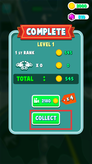 4、玩家完成關卡后,會顯示關卡完成提示以及獲得的金幣等獎勵信息,點擊COLLECT按鈕領取獎勵,點擊即可進入下一關。