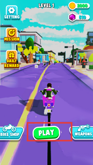 1、玩家下載游戲之后然后點擊進入游戲主界面,點擊PLAY綠色按鈕進入摩托車特技沖刺的游戲關卡。