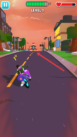 2、玩家進入游戲后,操控摩托車在城市道路上前進,通過左右移動屏幕來控制摩托車的方向,超越前方的其他摩托車手。