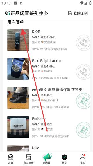 4、在鑒別中心瀏覽用戶曬單,查看DIOR、PoloRalph Lauren等商品的鑒別結果,了解鑒別師與鑒別時間,全面掌握閑置商品的鑒別情況。
