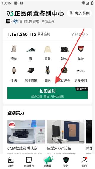 3、點擊鑒別進入95正品閑置鑒別中心,選擇拍圖鑒別,上傳商品圖片,享受超多類目、最快1分鐘出結果的鑒別服務,確保商品正品。