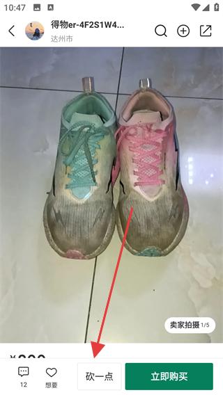 2、點擊感興趣的鞋子商品進入詳情頁,查看商品圖片與價格,點擊砍一點,參與商品砍價,或點擊立即購買,直接進入購買流程。