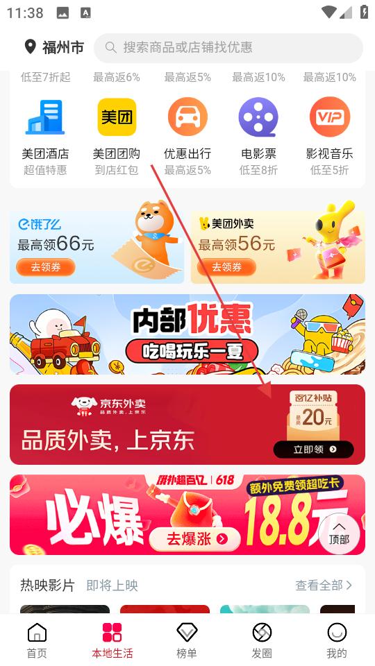 2、在本地生活頁面,找到京東外賣品質外賣上京東活動區域,點擊進入,查看相關優惠內容,選擇感興趣的商品。