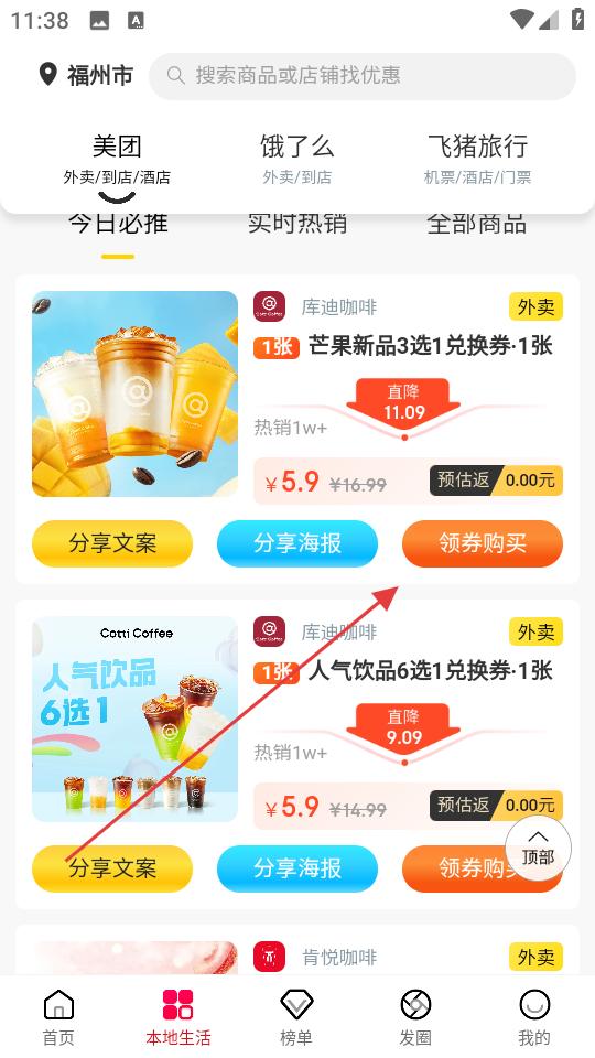 3、進入商品詳情頁,如庫迪咖啡優惠頁,點擊領券購買按鈕,按提示領取優惠券,完成購買流程,享受優惠福利。
