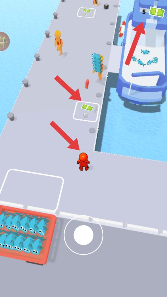 1、進入游戲,操控角色在碼頭等場景行動,靠近漁船,收集漁船上的魚,為后續交易等做準備。
