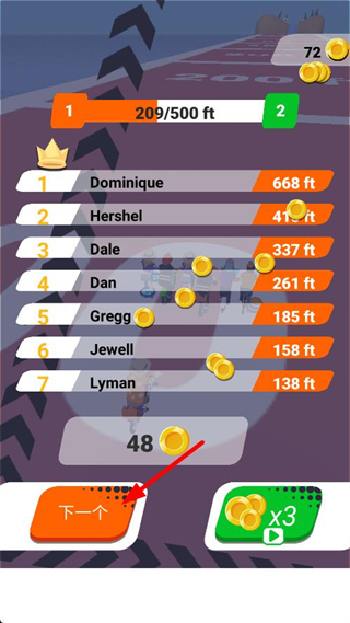 3、完成當前賽程后,查看排名與獲得的金幣收益,點擊下一個按鈕,進入新的競速關卡。