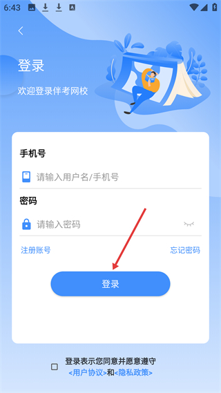 1、登錄界面可輸入手機號、密碼登錄,也能注冊賬號或找回密碼,登錄需勾選同意用戶協議與隱私政策。