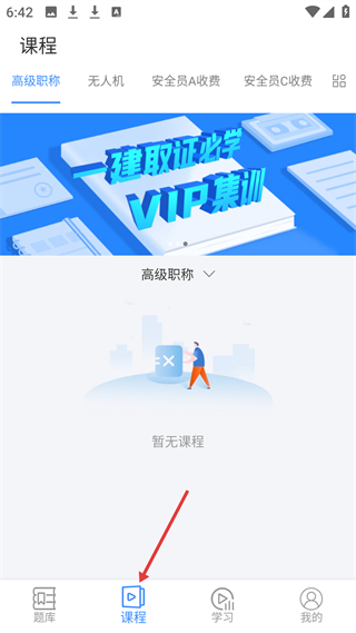 3、課程頁面劃分多類別,展示一建取證必學VIP集訓等課程推薦,當前高級職稱類別下暫無課程可供學習。