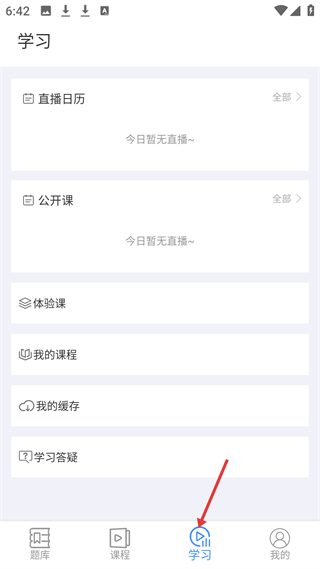 4、學習頁面包含直播日歷、公開課等板塊,今日無直播安排,還可查看體驗課、我的課程、學習答疑等學習相關內容。